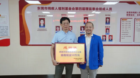 东莞市残疾人福利基金会向许绍伟先生颁发了爱心牌匾,以表达对其衷心的感激之情。感谢他长期以来对基金会的不懈支持,以及对助残公益事业的贡献。