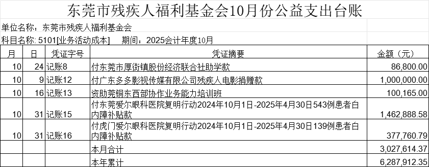 东莞市残疾人福利基金会2025年9月公益支出台账