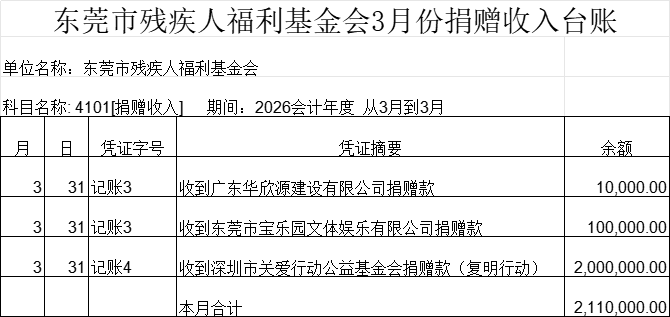 东莞市残疾人福利基金会2026年3月捐赠收入台账